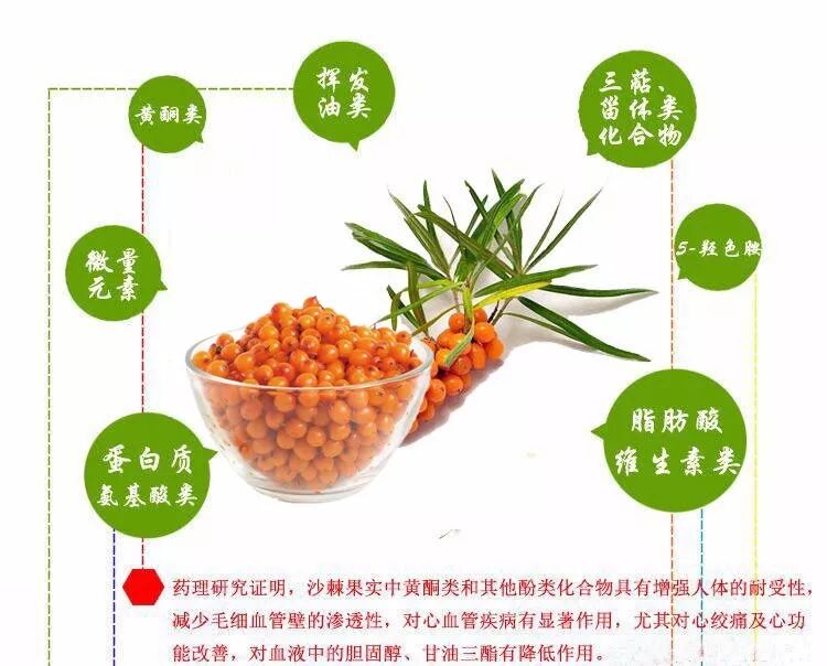 中华野生沙棘果实有VC之王的美称,果实入药具有止咳化痰、健胃消食、活血散瘀之功效。现代医学研究,野生沙棘果能有效调节肠胃功能;护肝防止肝硬化;预防心脑血管疾病;预防肿瘤;提高免疫力;利肺化痰止咳平喘;带动末梢微循环;淡化皮肤斑痕。