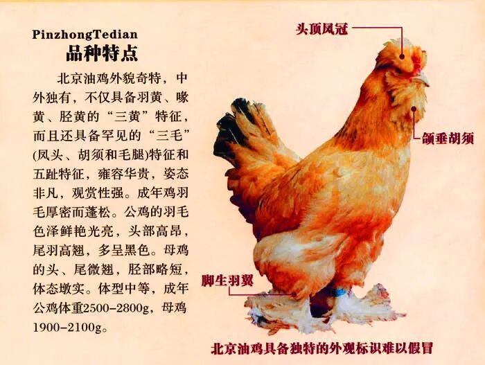 北京油鸡是北京地区优良的肉蛋兼用型地方鸡种,它具有羽黄、喙黄、胫黄的“三黄”特征,而且还有罕见的毛冠、毛腿、毛髯的“三毛”特征和五趾特征,肉质结实鲜美,蛋品营养高,由于浓密的羽毛覆盖油鸡只适应北方亚热带气候生长。