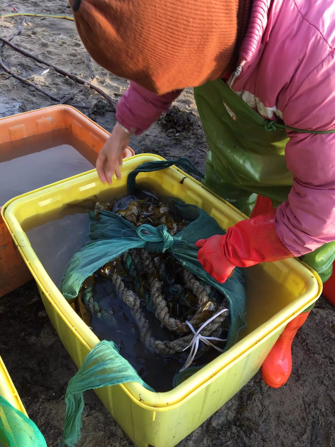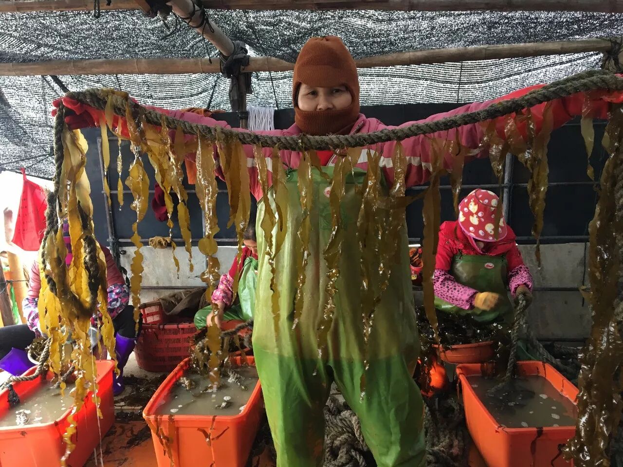 家族有一半的人都从事了海带养殖,每年12月份要在最冷的时候系苗,系好苗放入海里,经过5个月后海带在海里自然生长,清明节过后,便开始收成。系海带苗要在最冷的时候系,这样海带苗容易存活,但系苗的人就惨了,海边海风大,只能在沙滩上搭起个简易小屋,略加遮挡,然后在寒冷的水里捞苗系,却是冻手。