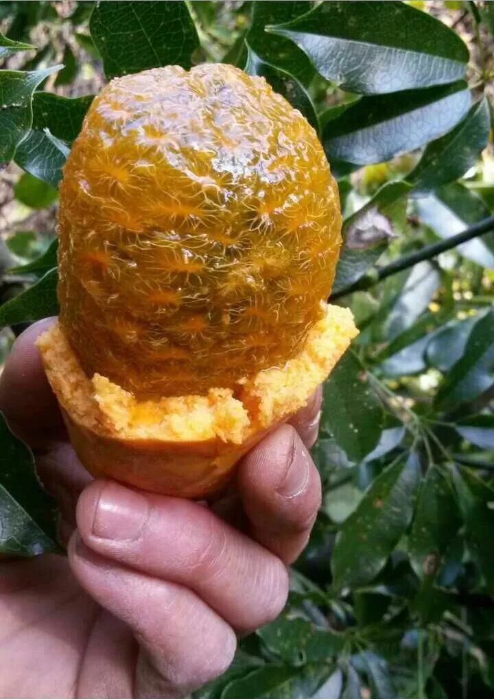 这个野果在本地也是随区位不同生长,还在研究它的生长规律。在农村一般是剥皮带籽一块吞吃,对于清除体内宿便、排毒有奇效。香蜜果在当地有几百年的历史,具体没有做详细记载,是祖辈传承的美味,当野果成熟季节到来时是小孩子们的最爱,现在大家谈起这个“牛卵坨”都十分的怀念。