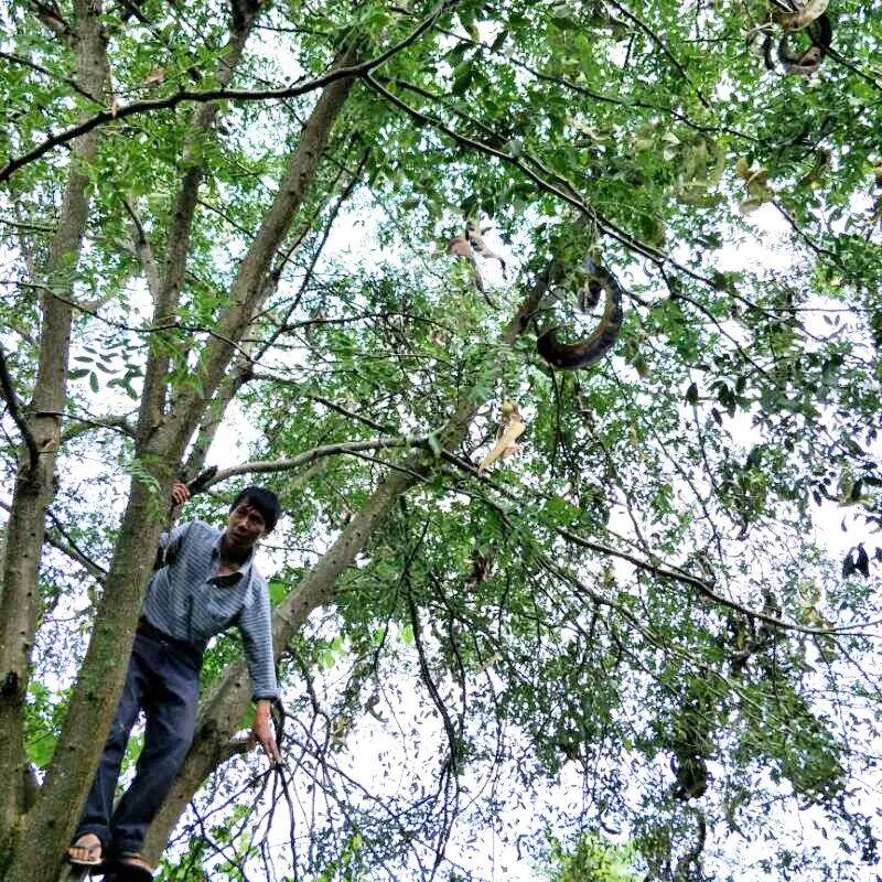 由于野生皂荚树树干十分高大,每年采摘豆荚都是一项很危险的工作,树上的人要借助竹竿把皂荚打下来,所以也叫“打皂角”。