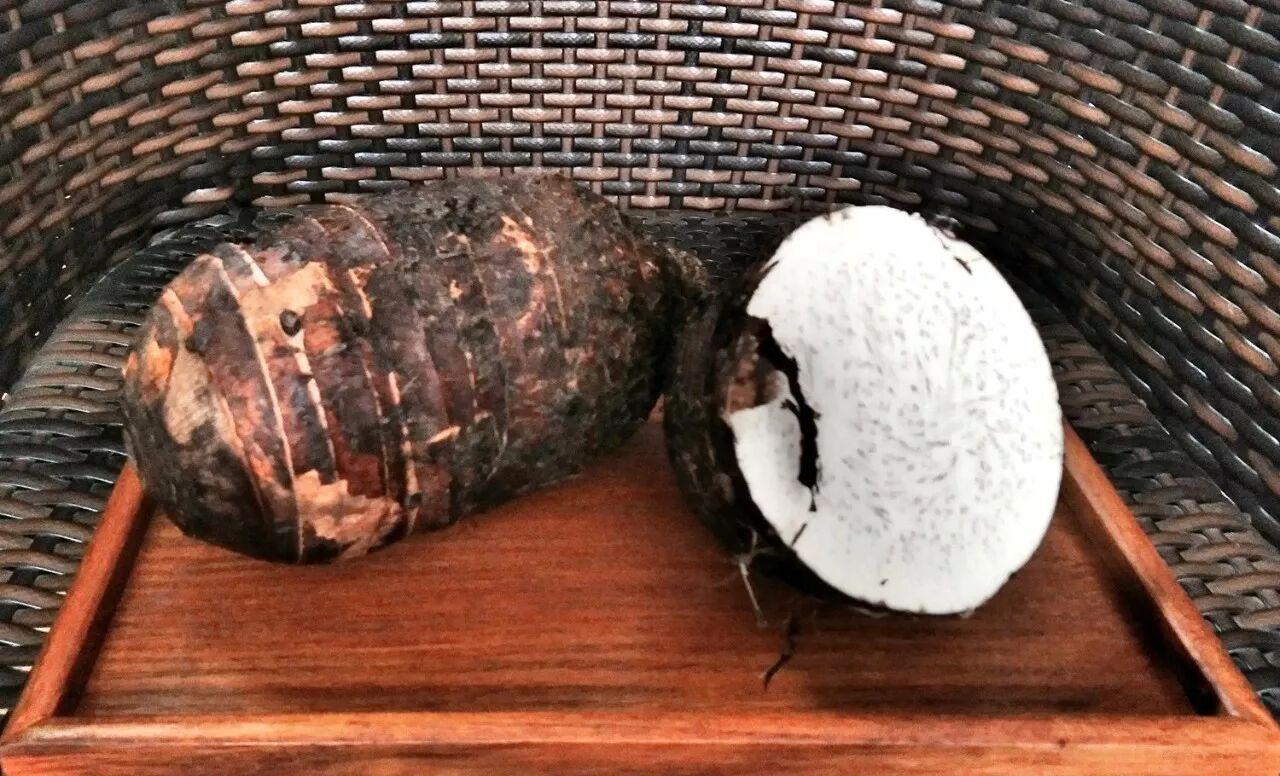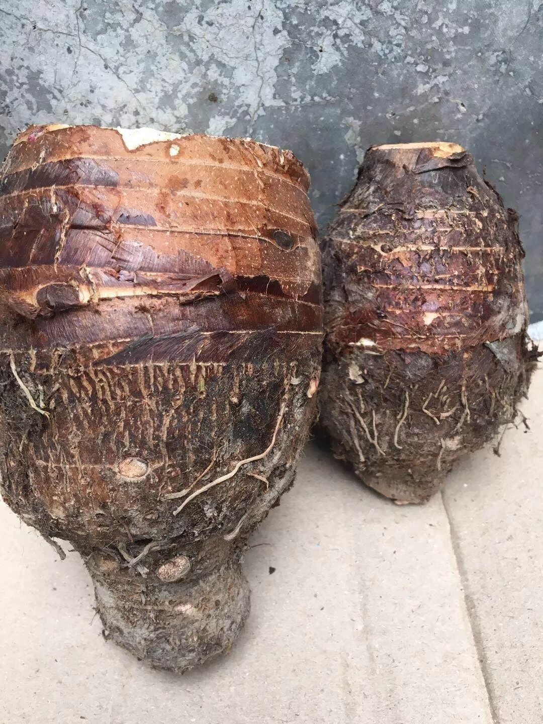 图中左边是杂交芋头,由于生长快表皮颜色浅,右边为传统品种荔浦芋头。