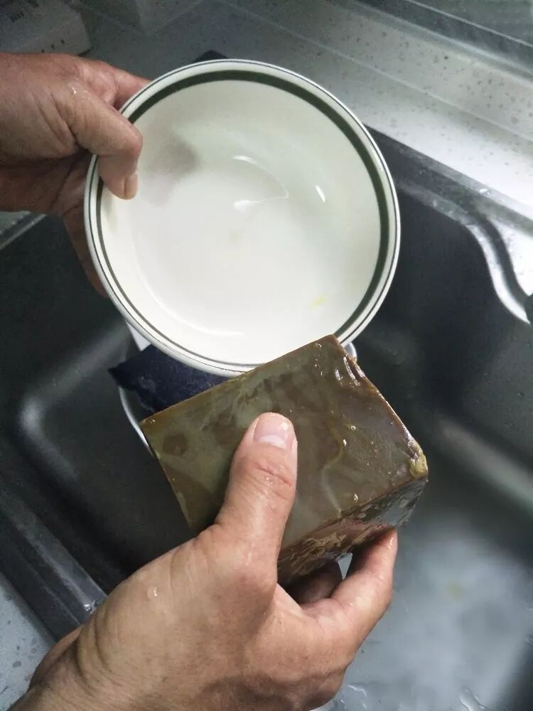 茶皂使用时,不必搭配任何其它洗涤液,刷洗过程中茶皂会有黄褐色皂液,溶水洗涤十分彻底,油脂油污及时分解,冲水后碗碟器皿亮丽如新,且毫无异味。