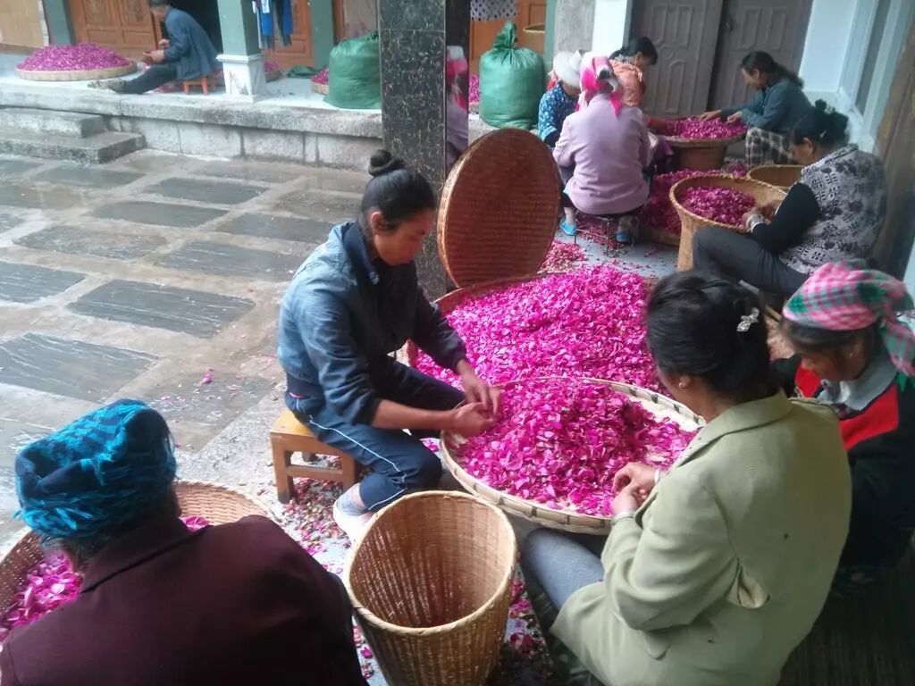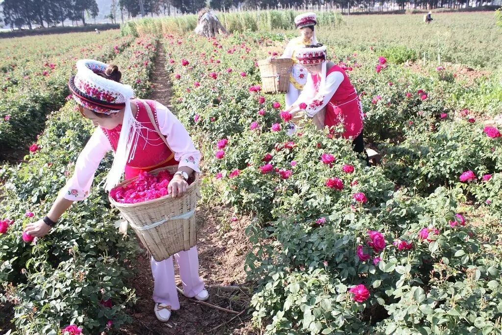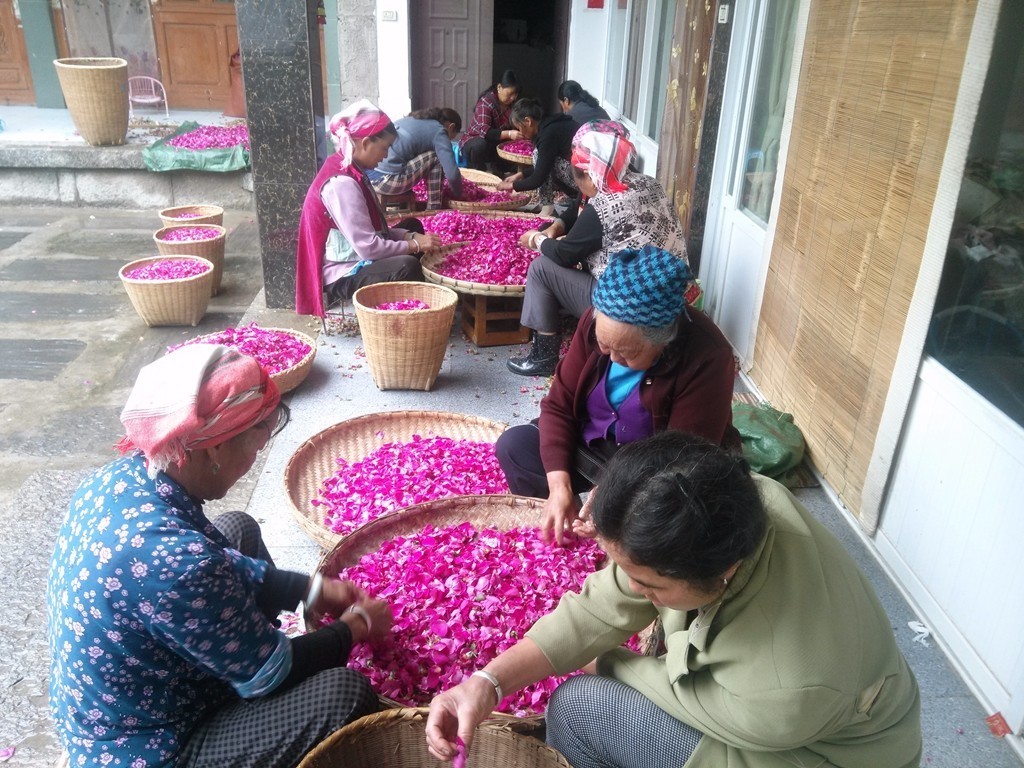 由于云南气候适宜,这里拥有很多观赏类花卉和食用花卉,杨金黎家做玫瑰酱的玫瑰花品种叫重(chong)瓣玫瑰,相比在市面上只能泡水喝的玫瑰品种,重瓣玫瑰是云南特有的可食用玫瑰,当地人除了做花酱,还可以入菜、入药、晒干或鲜花泡水。重瓣玫瑰株形直立开张,高约2米;开花时数朵簇生,芳香浓郁,花色浅紫,花瓣呈4—5层大朵绽放,花期在每年4月到6月间。它具有一定的营养价值,用白菜举例,钙、铁、镁等的含量分别是3.7倍、9.5倍和4.8倍,钙的含量是菠菜的2倍,还富含维生素A、B、C、D和花单宁,经过重度发酵的重瓣玫瑰还富含多种活性酶、氨基酸和叶酸的成分,因此,智慧的大理白族先祖让重瓣玫瑰花成为每一户清白传家的庭院中不可缺少的一抹紫红。