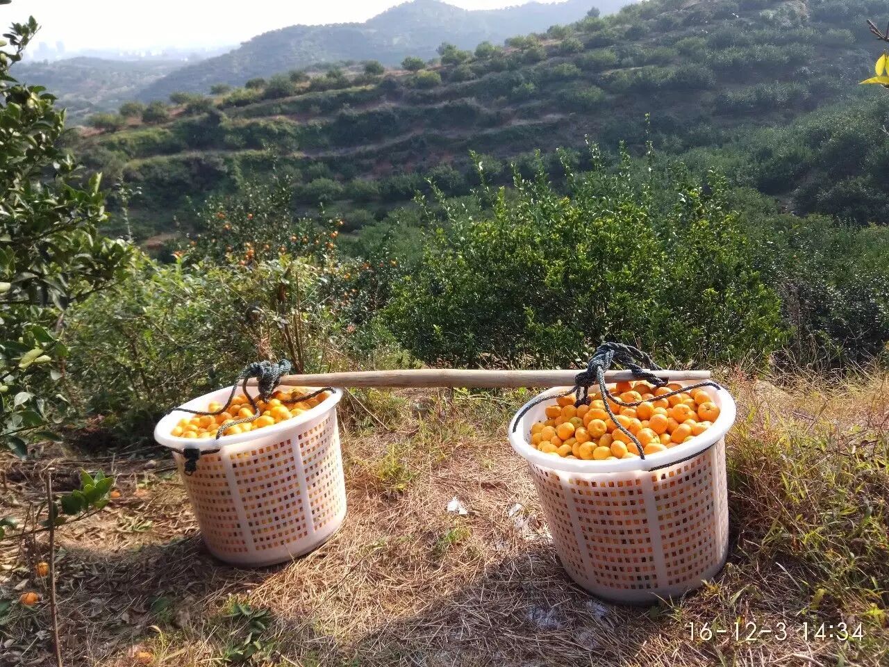 就说把橘子运下山吧,一次,面对着6个帮工帮忙采下来的四千斤橘子,硬是他一个人全部挑下来的。一趟120斤,上山下山总共要花三个半小时,这样来来回回跑了三四十多趟才全都挑完。