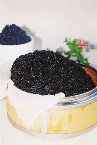 吸收了乌饭树叶精华的糯米蒸熟后,就成了乌米饭,添加少许白糖,植物的芬芳与糯米的甘甜交相辉映。