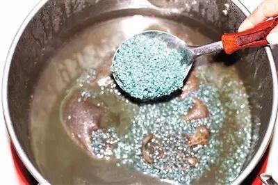 用水将新鲜采摘的乌饭树叶洗净,沥干,放入石槽,用木杵细细捣烂,直至叶子被捣碎成汁,释放出沁人心脾的香气,加入清水,反复挤压,滤出缥青色的汁水,这是乌米饭独特外观和味道的秘密所在,最后,将淘洗干净的糯米加入其中,浸泡一个晚上。
